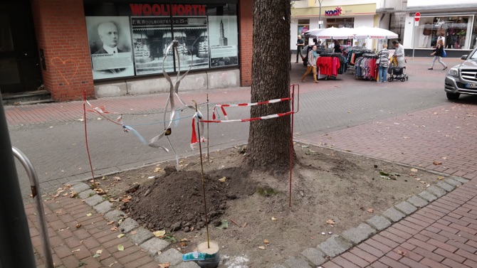 A bent metal bar with a washed concrete pedestal - Micky Mouse is waving hello from a sticker.